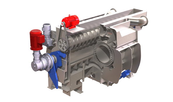 雙輥擠漿機(jī)是采用壓榨原理完成整個(gè)工作過程的。漿料通過泵送入雙輥擠漿機(jī)的壓榨輥與槽體組成的牛角狀脫水區(qū)中,由于進(jìn)漿形成一定的壓力,通過多孔的輥面濾板進(jìn)行過濾脫水,經(jīng)輥兩端開口排出,輥面上形成連續(xù)漿層。隨著壓榨輥的轉(zhuǎn)動(dòng),漿料的濃度隨著壓榨輥的轉(zhuǎn)動(dòng)逐步提高,可達(dá)到10%左右(或到達(dá)置換區(qū)時(shí)漿料與洗滌液接觸,置換漿中原有濾液,這種置換作用一直進(jìn)行到漿料進(jìn)入壓榨區(qū)為止) 。漿料繼續(xù)隨著壓榨輥的轉(zhuǎn)動(dòng)進(jìn)入兩壓榨輥之間的壓榨區(qū),通過壓榨脫水使?jié){料濃度進(jìn)一步提高,最高可達(dá)到30%左右。在雙輥之間的壓榨區(qū)所形成的漿餅可通過兩套刮刀從輥面上剝離下來,進(jìn)入出料螺旋,然后經(jīng)過破碎螺旋撕碎,并排出雙輥擠漿機(jī)。