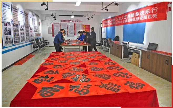 春聯(lián)是一種文化藝術(shù),也是一種文化傳承和情感表達(dá),寄托著人們對(duì)美好生活的向往和追求。為深入學(xué)習(xí)貫徹落實(shí)習(xí)近平文化思想,進(jìn)一步傳承中華優(yōu)秀傳統(tǒng)文化,豐富廣大職工精神文化生活,2024年1月29日下午安陽(yáng)市書(shū)法家協(xié)會(huì)舉辦的“百花迎新樂(lè)中原——萬(wàn)福迎春”義寫(xiě)春聯(lián)公益活動(dòng)走進(jìn)中國(guó)聯(lián)合裝備集團(tuán)安陽(yáng)機(jī)械有限公司,為企業(yè)一線廣大職工送上新春祝福。