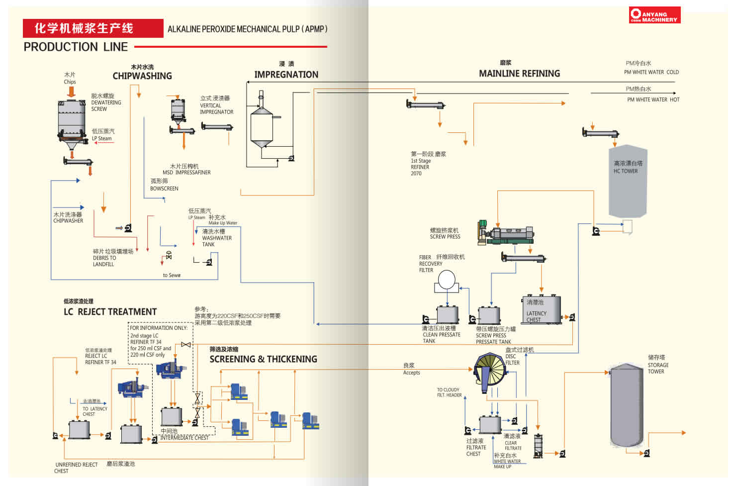 APMP紙漿工藝主要特征包括色漿高度潔白、產(chǎn)量高、使用化學品、低污染等,其是一個高產(chǎn)紙漿新工藝。漂白過程中使用化學品和藥物較少,APMP紙漿與化學紙漿(其產(chǎn)生大量黑液)不同,因此,該APMP工藝對環(huán)境無污染。